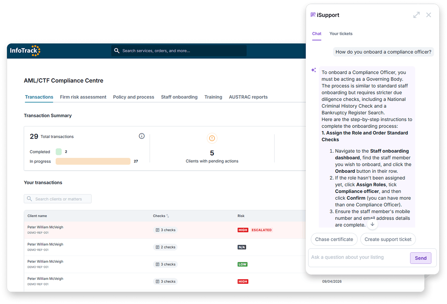 Imagine having an InfoTrack expert sitting with you at all times, ready to answer questions, guide your next step and keep your compliance moving forward.