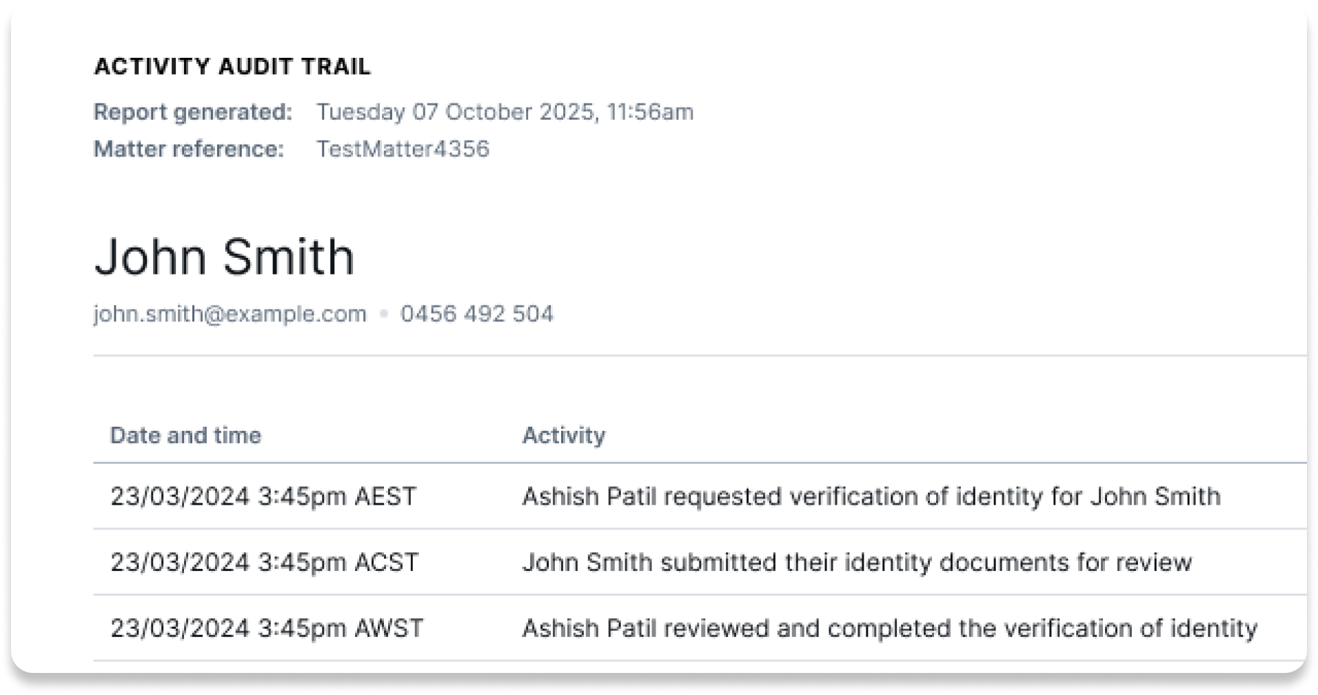 InfoTrack delivers automated, end-to-end record keeping inside the Compliance Centre, ensuring Tranche 2 entities always meet AUSTRAC’s retention requirements. All data is tracked via an activity log and stored for 7 years inside the Compliance Centre.
