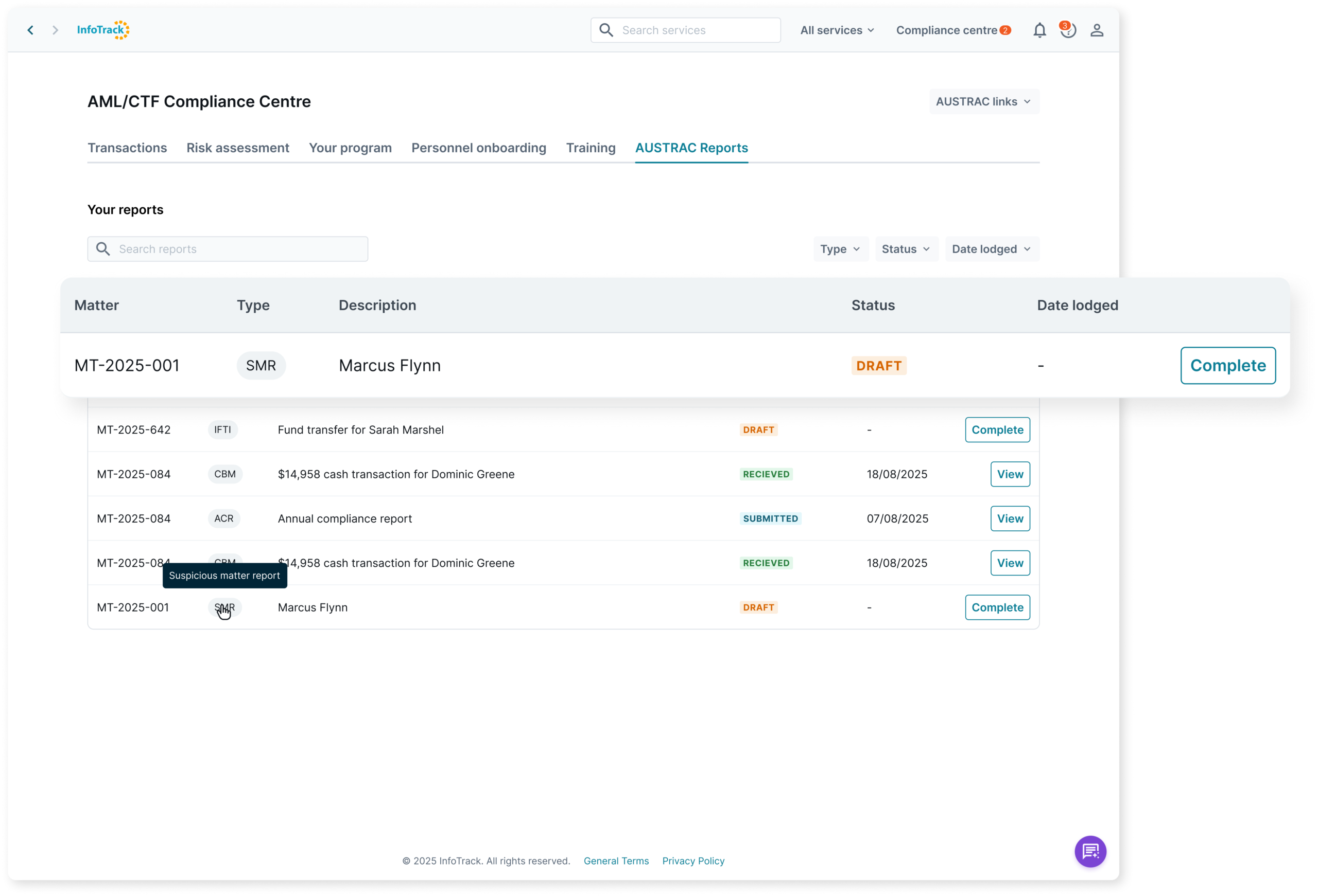 Tranche 2 entities are obligated to report certain clients to AUSTRAC based on their risk and behaviours. InfoTrack gives users the ability generate Suspicious Matter Reports, Transaction Threshold Reports and more, directly from the matter. Information is prefilled where possible and sent directly to AUSTRAC, as well as being stored inside the Compliance Centre for audit purposes.