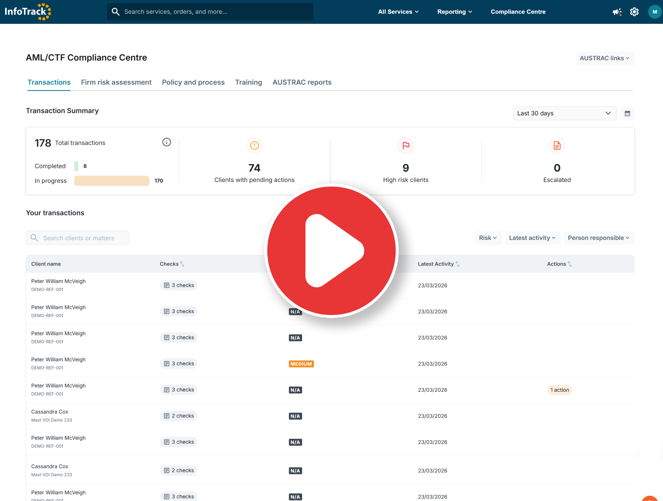 The Compliance Centre helps firms meet AML/CTF obligations by combining VOI, client onboarding, risk checks and compliance workflows in a single platform.